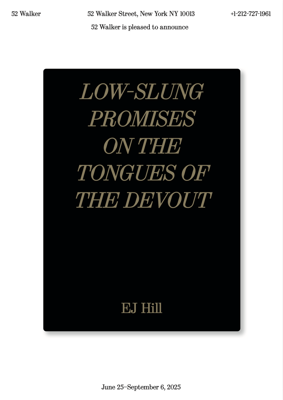Exhibition identities for 52 Walker’s fifteenth, sixteenth, seventeen and a half, and seventeenth shows, featuring Lotus L. Kang, EJ Hill, Raymond Pettibon, and Nicole Eisenman. These conceptual identities tie into the core themes of each exhibition and their unique viewpoints.